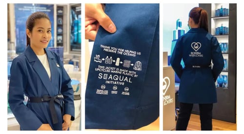 ชุดยูนิฟอร์มโฉมใหม่ของเหล่า Biotherm Skin Experts ผลิตจาก Seaqual Filaments เส้นใยแปรรูปจากทะเล, Recycled Polyester เส้นใยสังเคราะห์โพลีเอสเตอร์จากการรีไซเคิล และ Organic Cotton ผ้าคัตตอนออร์แกนิก รวมไปถึงรายละเอียดเล็กๆ น้อยๆ อย่าง กระดุม ซิป และป้ายด้านในของเสื้อ ก็ยังเป็นวัสดุจากการรีไซเคิลเพื่อความยั่งยืนอีกด้วย