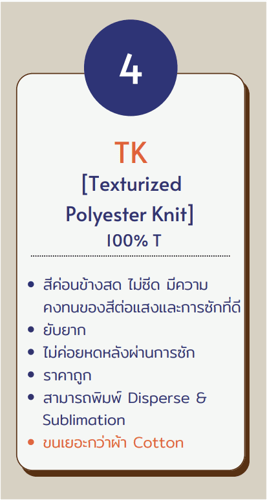 ผ้าคอตตอน เป็นผ้าที่ผลิตจากเส้นใยฝ้าย มีคุณสมบัตินุ่มสบาย ระบายอากาศได้ดี นิยมใช้ทำเสื้อยืดทั่วไป